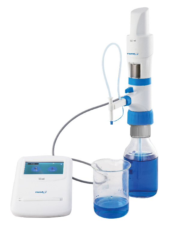 Volume: 50 ml, State-of-the art motor operated burette with three calibrated pre-set speeds and accuracy and precision conforming to ISO 8655 standards., The VWR® E-Burette is a motor operated burette with sophisticated features and functionality. Motor controlled piston movement eliminates the errors associated with manual wheel controlled piston movement, thus facilitating correct and comfortable titrations. Having the capacity of 50 ml, this burette can be flexibly operated at 3 calibrated pre-set speeds, including dropwise dispensing for fine volume adjustment. This helps in achieving accurate end point of the titration experiment., 04_BodyText: The VWR® E-Burette has a ‘recirculation mode’ which prevents loss of reagents during purging and facilitates bubble-free dispensing. The delivery nozzle of the burette can be adjusted in both horizontal and vertical directions providing easy dispensing in demanding laboratory conditions., 05_BodyText: The user-friendly TFT touchscreen guides quick and accurate titrations and displays numeric data up to the second decimal. A hand held stylus is provided as an accessory to assist touch operations on the control panel. The touch screen control panel can be used to perform functions like automatic re-fill without change of reading, zero reset, fill and dispense. The control panel is powered by a rechargeable, long lasting Li-ion battery. This battery can be easily replaced by the user., 06_BodyText: The instrument has computer connectivity through a mini USB cable. It has a built-in software which allows readings to be transferred and saved in a file on the computer., 02_BulletPoint: Motor controlled piston movement | Can be flexibly operated at 3 calibrated pre-set speeds: Fast, medium and dropwise | Recirculation mode to prevent the loss of reagent during purging | Flexible delivery nozzle to change angle of dispensing | User-friendly TFT touchscreen | Hand held stylus provided as an accessory to assist touch operations | Powered by rechargeable, replaceable long lasting Li-ion battery | Up to 20 results can be stored in the instrument memory | Computer connectivity through a micro USB cable, 13_Caution: Maintain instrument and reagent temperature between 10 to 40 °C (From 50 to 104 °F). Maintain reagent vapor pressure up to 600 mbar (maximum). Aspirate slowly above 300 mbar pressure in order to prevent the liquid from boiling. Kinematic viscosity up to 500 mm²/s. Relative air humidity between 20 and 90%. Use fluids with density up to 2.2 g/cm³., 08_Certifications: Meets ISO 8655 standard for accuracy and precision, manufacturing standards: ISO 9001, ISO 13485, ISO 17025 and product certification: CE, 10_Ordering: Supplied with a digital bottle top burette, a control panel, a micro-USB cable, telscoping tube, five thread adapters (28, 32, 38, 40 and 45 mm), stylus, amber colored window, user instruction manual and an individual quality control certificate that documents the serial number and test values, and confirms the conformity according to weights and measures regulations as per ISO 8655., VWR® E-Burette with motor piston, Cat. No.: 76319-574, Accuracy: ±0.05%, Precision: ±0.02%, Subdivisions: 10 µl, Final SAP Desc Link: 6796022, SAP Description Status: Ready, State-of-the art motor operated burette with three calibrated pre-set speeds and accuracy and precision conforming to ISO 8655 standards., The VWR® E-Burette is a motor operated burette with sophisticated features and functionality. Motor controlled piston movement eliminates the errors associated with manual wheel controlled piston movement, thus facilitating correct and comfortable titrations. Having the capacity of 50 ml, this burette can be flexibly operated at 3 calibrated pre-set speeds, including dropwise dispensing for fine volume adjustment. This helps in achieving accurate end point of the titration experiment., 04_BodyText: The VWR® E-Burette has a ‘recirculation mode’ which prevents loss of reagents during purging and facilitates bubble-free dispensing. The delivery nozzle of the burette can be adjusted in both horizontal and vertical directions providing easy dispensing in demanding laboratory conditions., 05_BodyText: The user-friendly TFT touchscreen guides quick and accurate titrations and displays numeric data up to the second decimal. A hand held stylus is provided as an accessory to assist touch operations on the control panel. The touch screen control panel can be used to perform functions like automatic re-fill without change of reading, zero reset, fill and dispense. The control panel is powered by a rechargeable, long lasting Li-ion battery. This battery can be easily replaced by the user., 06_BodyText: The instrument has computer connectivity through a mini USB cable. It has a built-in software which allows readings to be transferred and saved in a file on the computer., 02_BulletPoint: Motor controlled piston movement | Can be flexibly operated at 3 calibrated pre-set speeds: Fast, medium and dropwise | Recirculation mode to prevent the loss of reagent during purging | Flexible delivery nozzle to change angle of dispensing | User-friendly TFT touchscreen | Hand held stylus provided as an accessory to assist touch operations | Powered by rechargeable, replaceable long lasting Li-ion battery | Up to 20 results can be stored in the instrument memory | Computer connectivity through a micro USB cable, 13_Caution: Maintain instrument and reagent temperature between 10 to 40 °C (From 50 to 104 °F). Maintain reagent vapor pressure up to 600 mbar (maximum). Aspirate slowly above 300 mbar pressure in order to prevent the liquid from boiling. Kinematic viscosity up to 500 mm²/s. Relative air humidity between 20 and 90%. Use fluids with density up to 2.2 g/cm³., 08_Certifications: Meets ISO 8655 standard for accuracy and precision, manufacturing standards: ISO 9001, ISO 13485, ISO 17025 and product certification: CE, 10_Ordering: Supplied with a d