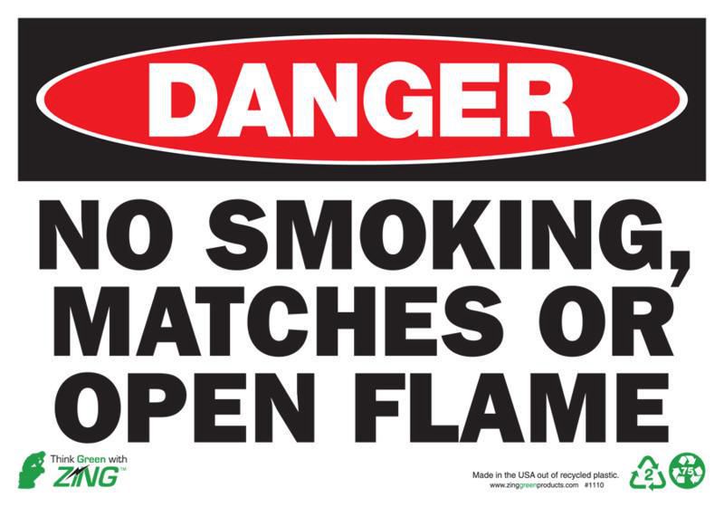 Sign Danger No Smoking Plastic 10X14In^ Danger Sign, Recycled Plastic, No Smoking, Matches Or Open Flame, Pre-Drilled Mounting Holes & Adhesive Tabs, Impact And Uv Resistant, Ul Validated For Recycled Content, 10X14I