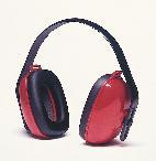 Lightweight Earmuffs^ Three-position, ultra-lightweight. For prolonged use and comfort. Weigh only 170g. The adjustable crown strap allows a secure fit when worn behind the head or under the chin. High visibility red cups with black band. Dielectric. Noise reduction rating of 25 dB.