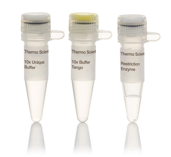 Conventional restriction endonucleases are a large collection of high quality restriction enzymes, optimized to work in one of the buffers of the Five Buffer System. In addition, the universal Tango buffer is provided for convenience in double digestions. All of the enzymes exhibit 100% activity in the recommended buffer and reaction conditions. To ensure consistent performance, Thermo Scientific restriction enzyme reaction buffers contain premixed BSA, which enhances the stability of many enzymes and binds contaminants that may be present in DNA preparations.5' G ↓A A T T C 3' 3' C T T A A ↑G 5' Thermo Scientific EcoRI restriction enzyme recognizes G^AATTC sites and cuts best at 37°C in its own unique buffer. See Reaction Conditions for Restriction Enzymes for a table of enzyme activity, conditions for double digestion, and heat inactivation for this and other restriction enzymes. Note: Also available as a FastDigest enzyme for rapid DNA digestion. In addition, the universal Tango buffer is provided for convenience in double digestions. All of the enzymes exhibit 100% activity in the recommended buffer and reaction conditions. To ensure consistent performance, Thermo Scientific restriction enzyme reaction buffers contain premixed BSA, which enhances the stability of many enzymes and binds contaminants that sent in DNA preparations.Features• Superior quality—stringent quality control and industry leading manufacturing process• Convenient color-coded Five Buffer System• Includes universal Tango buffer for double-digestions• BSA premixed in reaction buffers• Wide selection of restriction endonuclease specificitiesApplications• Molecular cloning• Restriction site mapping• Genotyping• Southern blotting• Restriction fragment length polymorphism (RFLP)• SNPNote: For methylation sensitivity, refer to product specifications.