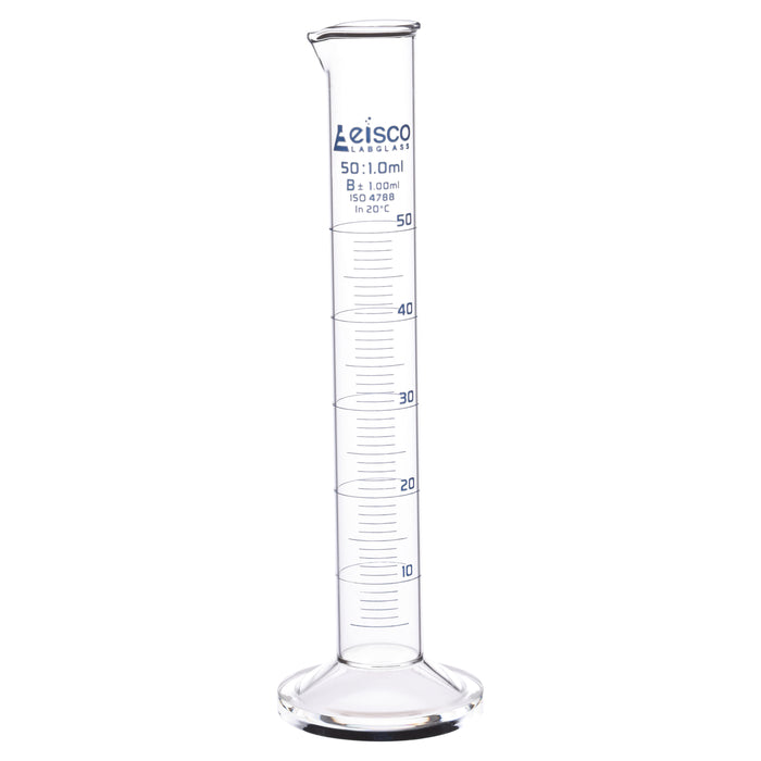 50ml graduated measuring cylinder made of high quality, heavy duty Borosilicate 3.3 glass. Spout for easy pouring, and round base for extra stability. Class B tolerance, ±1.00ml as per DIN EN ISO 4788 standard. Blue printed graduations and specifications. 1ml subdivisions. Cylinder stands 7.5" tall, with a base measuring 2" wide. Inner diameter of cylinder body measures 22mm (0.8"), and outer diameter measures 27mm (1"). Autoclavable, with superior chemical durability. Low temperature gradient- can withstand high temperatures & thermal shocks. Eisco Labs Borosilicate glass has the following heat tolerances: Strain Point -515°C | Annealing Point 565°C | Softening Point 820°C. Calibrated to contain.