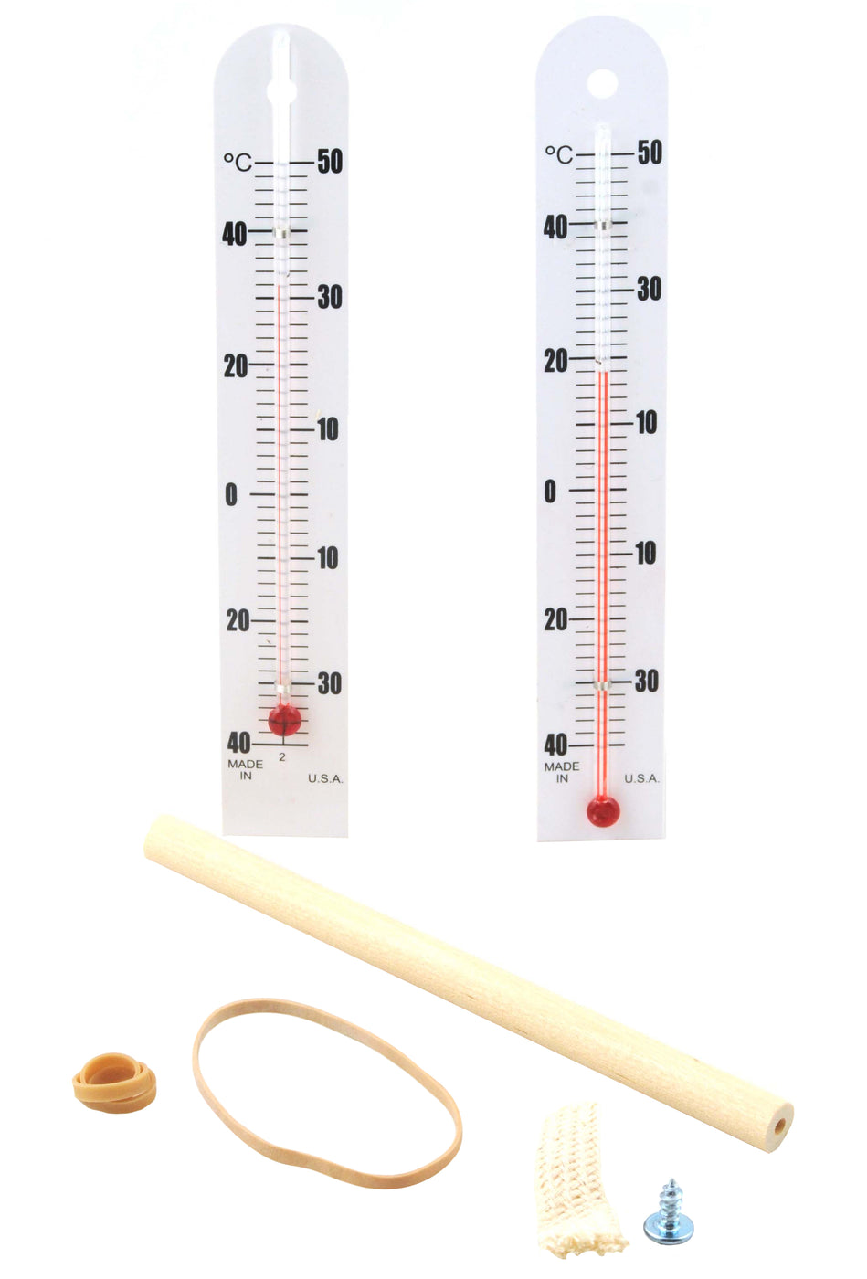 The 7-piece Sling Psychrometer Kit contains: (1) dry bulb thermometer (6.5"L), (1) wet bulb thermometer (6.5"L), (1) wooden handle (5"), (1) cloth sleeve, (1) screw, (2) rubber bands, (1) instruction guide The apparatus is easily assembled by attaching the two thermometers to the end of the handle and placing the moistened cloth sleeve over the wet bulb Once assembled the user swings the apparatus for 30 seconds then records the temperatures on both the wet-bulb and dry-bulb Relative humidity and dew point are determined by comparing the temperature difference between wet and dry bulb readings against the included psychrometric charts The interactive, hands-on Sling Psychrometer promotes student understanding of meteorology and weather