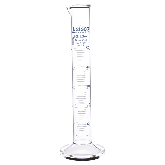 50ml graduated measuring cylinder made of high quality, heavy duty Borosilicate 3.3 glass. Spout for easy pouring, and round base for extra stability. Class A tolerance, ±0.50ml as per DIN EN ISO 4788 standard. Blue printed graduations and specifications. 1ml subdivisions. Cylinder stands 7.5" tall, with a base measuring 2" wide. Inner diameter of cylinder body measures 22mm (0.8"), and outer diameter measures 27mm (1"). Autoclavable, with superior chemical durability. Low temperature gradient- can withstand high temperatures & thermal shocks. Eisco Labs Borosilicate glass has the following heat tolerances: Strain Point -515°C | Annealing Point 565°C | Softening Point 820°C. Calibrated to contain.