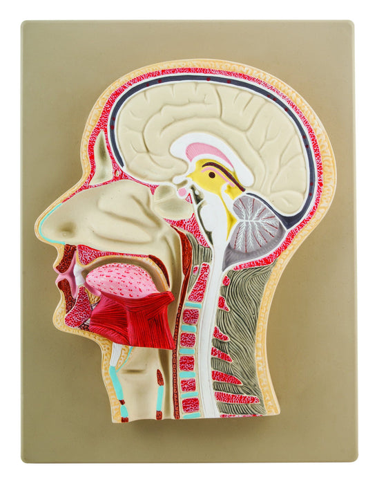 Premium model showing half of the human head. Shows the median section of human head, brain, nose, mouth, and pharynx, larynx and vertebral column of the neck. Life size model. Beautifully hand painted with precise detail. Parts are numbered for easy identification with the included key card. Mounted on wooden base measuring 13" long, 10" wide, and 1" tall. Head model measures 10" long, 8" wide, and 1" tall.