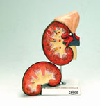 Model shows kidney with adrenal gland, plus renal and adrenal vessels and upper portion of ureterFront half of kidney removes to show cortex medulla and vessels, as well as renal pelvisFeatures numberedSupported on base