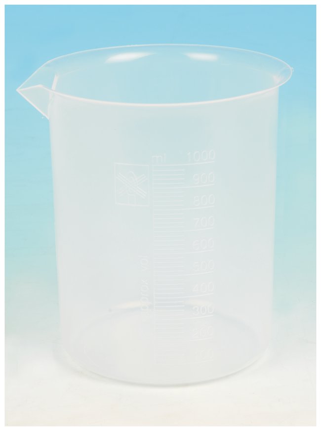 Pack of 12, 1000ml beakers made from premium-quality, translucent polypropylene plastic. The beakers have 20ml raised graduations and specifications. Each features a tapered spout for easy pouring. They measure 5.8 inches tall and 4.6 inches in diameter, with an inner diameter of 4.4 inches. These beakers are microwavable, autoclavable, and offer superior chemical durability, able to withstand temperatures between -20°C and 135°C.