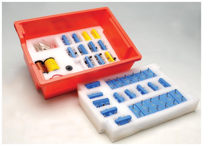 The Basic Electricity Kit has been designed as a low-cost, attractive and flexible alternative to the “circuit board” approach to investigations into simple circuits.Each component such as a switch, rheostat, bulb holder, etc., is mounted on its own individual plastic panel with 4mm sockets. The panels are then formed into circuits by connecting them using 4mm stackable leads. Because this is “real circuit making,” the equipment will find users throughout secondary school science curricula. Each kit is supplied in two polystyrene trays that keep the units organized. Designed as a resource for the teaching of introductory electricity, these kits include well-structured instructional material and robust components mounted on tough, yellow plastic bases, each with two 4mm sockets. Kit A is for a group of up to six students, while Kit B contains additional items and consumables that could be issued by teachers as required. Only one Kit B would be needed by a class. A Teacher's Manual is included in Kit A that introduces each item of equipment and a range of tasks and investigations. Topics covered are bulbs and cells, switches, electromagnets, motors and buzzers.An introductory circuit kit for children, with workcards covering the following topics: lighting a lamp, using motors, using a switch, a model house, lamps in series and parallel, making an electromagnet, conductors and insulators, a quiz for three or four people, heat from electricityComponents are mounted on bright blue bases, each with two 4mm diameter socket