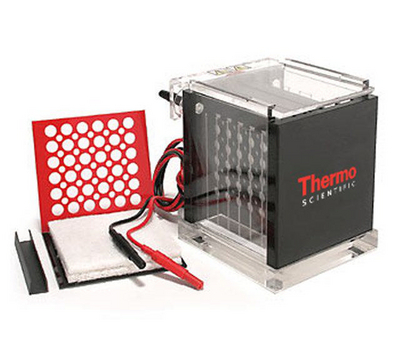 Bandit* Mini Tank Electroblotting System^ Transfer area: 9Wx9Lcm. Footprint: 13Wx18Lx16.5Hcm. Buffer volume: 1.4L. Has chamber with platinum wire electrode panels, safety interlocking lid with attached power supply leads, 4 blotting cassettes with foam pads, 16 sheets 9Wx9Lcm blotting filter paper.