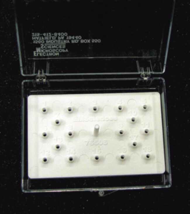 The EMS Specimen mount Box and holder is a unique storage box for Pin mounts with 3.2 mm (1/8") Pins. The box is numbered 1-18 and it can accept mounts ranging in size from 6.4 mm to 50 mm. With the ability to hold as follows: 18 of 12.7 mm; 8 of 25 mm; 2 of 32 mm and even 38 or 50 mm The maximum specimen height between mount surface and closed lid is 16 mm (5/8").