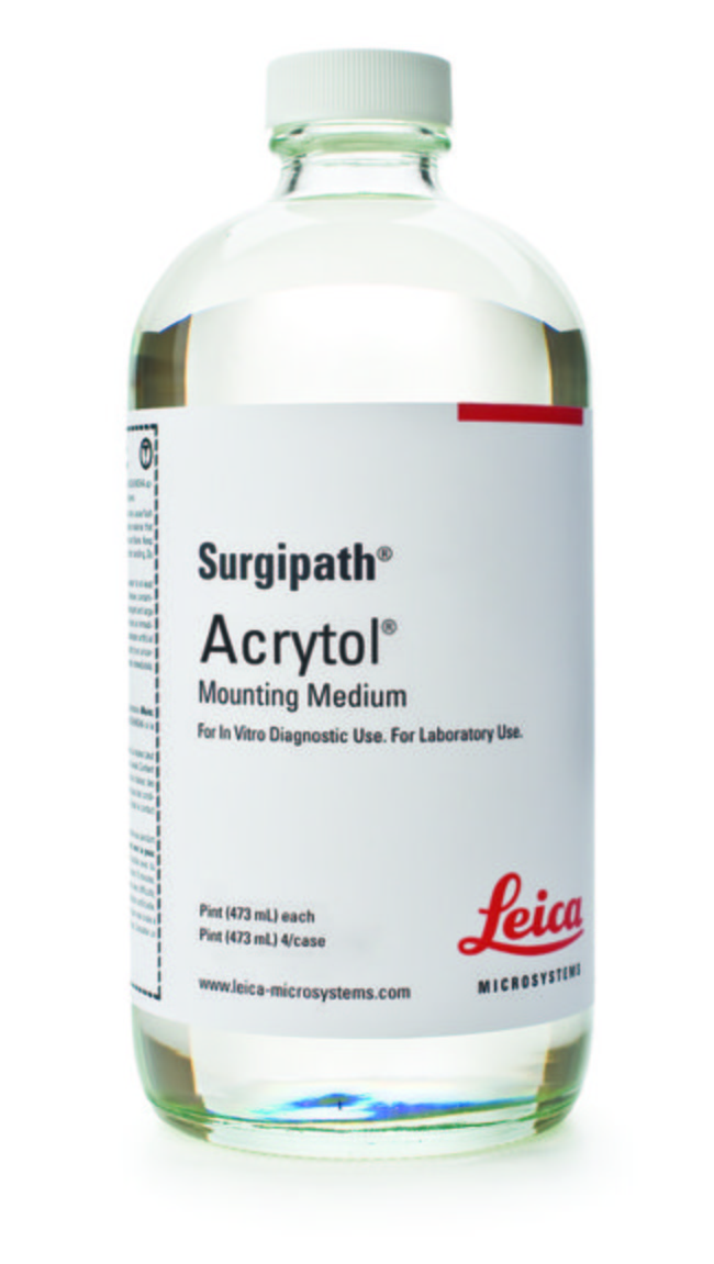 Acrytol is a rapid-drying mounting medium which enables slides to be screened immediately. It has a low viscosity, allowing the medium to flow easily. It also prevents air bubbles from becoming trapped. Acrytol contains an antioxidant to inhibit stain fading and prevent the formulation of annual rings. A thin coating of Acrytol is all that is needed to adhere a coverglass to a microscope slide.