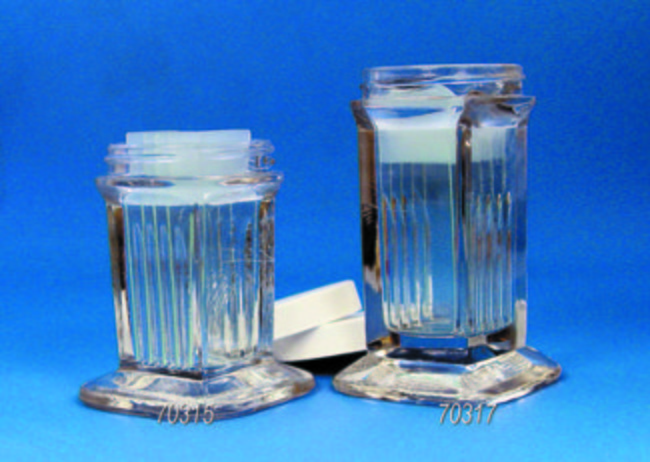 5-Slide Unit. Holds 5 single 1"x3" slides vertically, or 10 slides back-to-back. Slides extend above the opening, allowing for the manipulation of them without the use of forceps. A screw cap has a metal foil liner that withstands stains and organic solvents and it prevents evaporation.