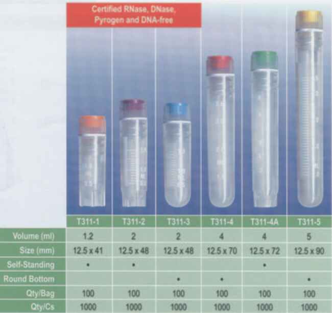 Specially Formulated Polypropylene, is certified Rnase-free, Dnase-free, Pyrogen-free, and DNA-free. Series T309 is a lip-seal design tube with external threads. Series T310 has a silicone washer seal and external threads. Series T311 has a silicone washer seal with internal threads. Silicone washer seal, external threads.
