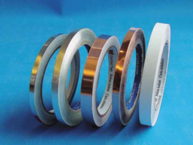 The conductive tape is used in scanning electron microscopy specimen mounting. Copper foil tape (Scotch 1181) with conductive adhesive. 3" core and foil thickness: 1.4 mils. Total thickness: 3mils (.076mm), adhesion: 35oz/in, electrical resistance: .005ohm/in(.032ohm/cm)