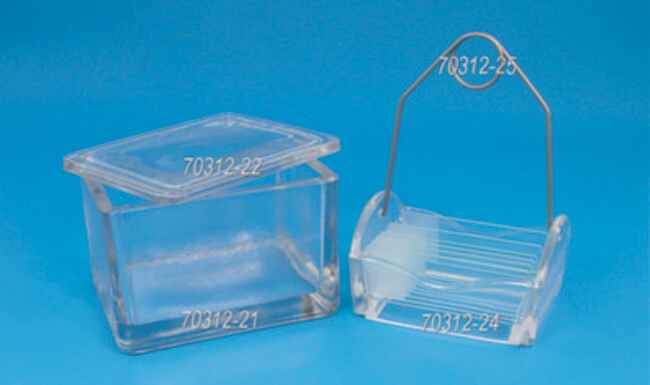 Ideal for immersing slides in several solutions. Removable glass slide rack has an open bottom for rapid filling and draining. Holds 20 slides.