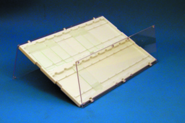 Made from heat resistant injection molded plastic. Hold up to twenty standard microscope slides 75 x 25 mm (3x1") and is made of two parts: a base holding the slides horizontally offering numbered space for easy identification, and transparent doors which can either cover the slides or be swung behind the SlideFolder for space conservation while using the tray. Each slide location is identified with a number from 1 to 20. Removal of the slides is made easy by simply pressing on one end, which will lift the other end up. The two transparent hinged covers offer a full view of each stored slide, even bar codes can be read without removing of the slide. All units are stackable and will resist temperatures between –80 degree C and 100 degree C. They are not autoclavable.