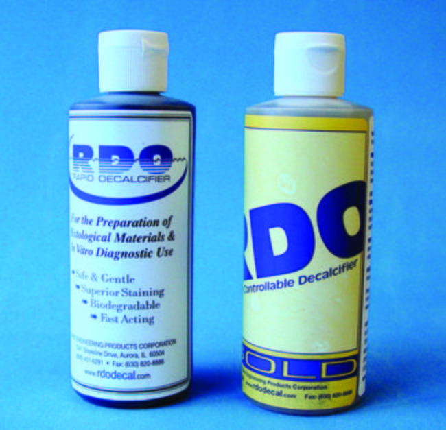 RDO Decalcifier was developed with the basic premise of making your work routine quicker and easier without sacraficing the quality and integrity of your samples. It is a remarkably effective multipurpose decacifier that can be tailored to suit your specific lab routine. RDO is safe, non-toxic, and non-corrisive. It is dilutable, microwavable, biodegradable, and translucent. Offers crisp nuclear staining and definition, gives distinguishable chromatin and shows great surface decalcification. It is safe enough to be disposed down lab sink to drain.