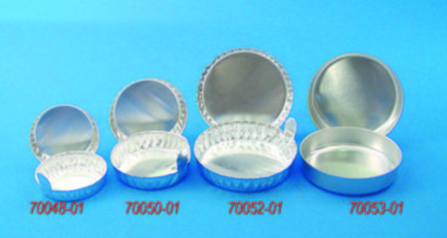 Inexpensive, disposable aluminum foil dishes with crimped sides, flat smooth bottoms, and a finger tab handle on the rim. Used for routine weighing and moisture testing, and an embedding mold, dimensions: