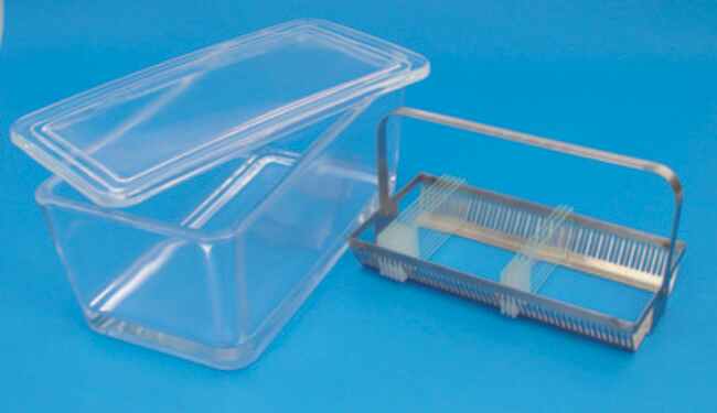 A stainless steel slotted rack that holds 50 slides in sizes: 3 in. x 1 in., 3 in. x 1, and 3 in. x 2 in.. Rack is resistant to staining solutions and has permanently attached handle