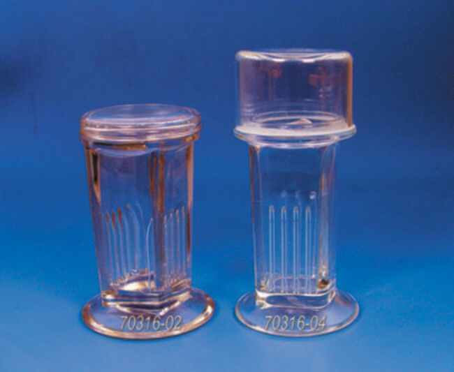 An all glass jar which holds 5 to 10 standard slides (3"x1"). They can be used as a chromatography jar with a choice of 2 ground glass lids. The lids are ground to the flange of the jar which deters evaporation. The jar with a taller lid (70316-04) accommodates larger slides: 4"x1" (100 mmx25 mm). An all glass jar which holds 5 to 10 standard slides (3"x1").