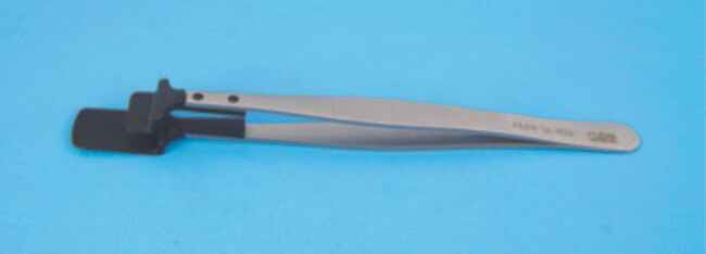 Serrated handles. For handling gallium or silicon wafers. Stopping pins turned up on lateral edges and graduated lower paddles prevent wafer slipping. Clean-room compatible. Clean-room compatible. Length: 138mm (5 in.).