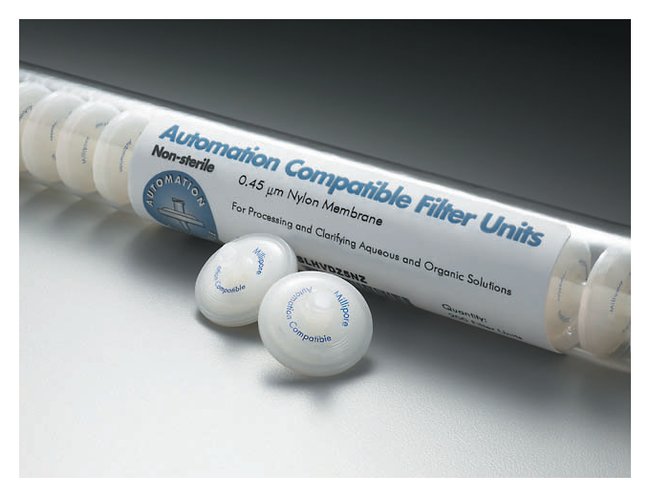Automation-Compatible, Non-Sterile Millex™ Syringe Filters:Designed to provide efficient filtration for dissolution and other automated sample preparation applications Domed housing ensures reliable delivery of filtersAvailable in a variety of membrane types and pore sizes, including units with prefilters for particulate-laden samples.Available in either bulk or delivery tubes for use with automated filter-changing systemsLuer-Lok™ connection optimized for precise alignment and fitApplications:Drug Dissolution TestinAutomated Sample PreparationClarification of Solutions Containing High Particle Level