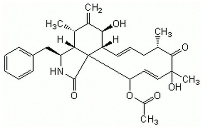 Cytochalasin D, Zygosporium mansonii, CAS 22144-77-0, is a fungal toxin that is about 10-fold more potent than cytochalasin B in inhibiting actin filament function. Blocks cytoplasmic division.