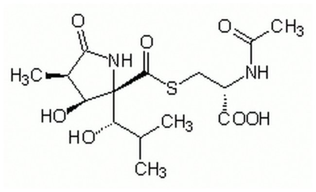 Lactacystin, Synthetic, CAS 1258004-00-0, is an irreversible inhibitor of 20S proteasome inhibitor (IC50 = 500 nM). A covalent inhibitor of the chymotrypsin & trypsin-like activities of proteasome.