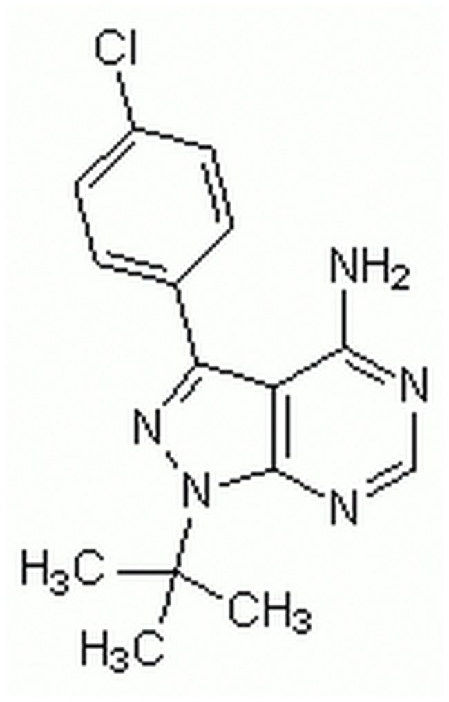 PP2, CAS 172889-27-9, is a potent, reversible, ATP-competitive, inhibitor of the Src family of protein tyrosine kinases (IC50 = 4, 5, 5, & 100 nM for p56lck, p59fynT, Hck, & Src, respectively).