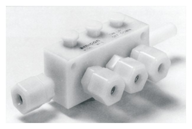 Can pressurize up to three cells or reservoirs from one gas source or feed several cells from one reservoirSeveral manifolds can be combined to operate more than three units in parallelMade from delrin plastic, Buna-N materialChemically sanitizableDimensions: 4 x 2 x 2 in. (10 x 5 x 5cm)