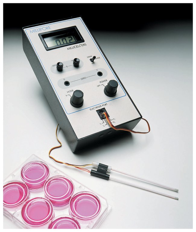 Provides qualitative measurement of cell monolayer health and quantative measures of confluency. Designed exclusively for use with cells cultured in Millicell™ Culture Plate Inserts.Utilizes AC current for membrane resistance measurements, producing a zero net charge on cells and eliminating adverse DC current effects on cell membranes. A silver/silver chloride (Ag/AgCI) pellet on each electrode tip measures voltage. Due to the small size of the electrodes, the user can easily measure transepithelial voltage and the resistance of cells grown on microporous membranes.