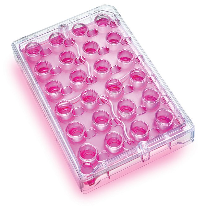 Designed to support cell attachment, growth, and differentiation for a variety of applications24-well feeder tray incorporates a tear-drop well design to reduce the incidence of air bubbles that can form under the membrane during plate assembly, ensuring that cell monolayers are getting the proper nutrientsSingle-well feeder tray utilizes baffles to reduce media leakage and contaminatio
