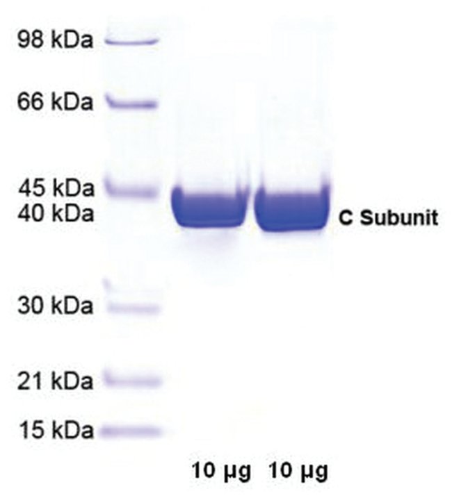 Native PKA catalytic subunit purified from bovine heart. The catalytic subunit of PKA dissociates from the PKA holoenzyme following binding of cAMP to the PKA regulatory subunits and phosphorylates target proteins at serine and/or threonine within the recognition motif, Arg-Arg-X-Ser-X. The purified monomeric catalytic subunit does not require cAMP for activation and is suitable for studies of PKA phosphorylation in vitro with purified substrates or following its introduction into intact cells or cell extracts.