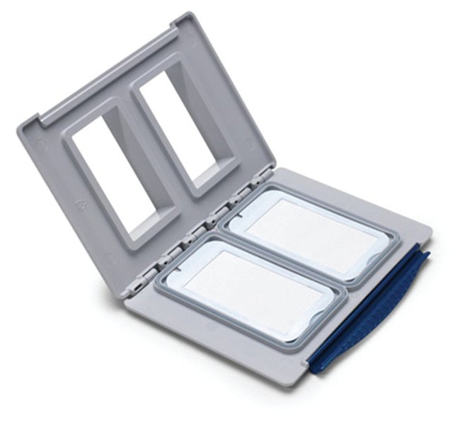 Multiblot HolderEach half blot membrane is aligned horizontally, allowing for uniform distribution of antibodyFlat profile allows for compact space allocation for storage, shipping and waste managementSize: 4.5 x 8.4cmMultiblot Holding frameStackable frame with lid, easy locking latch and umbrella valve for offline incubationClear lids retains humidityWestern Blotting