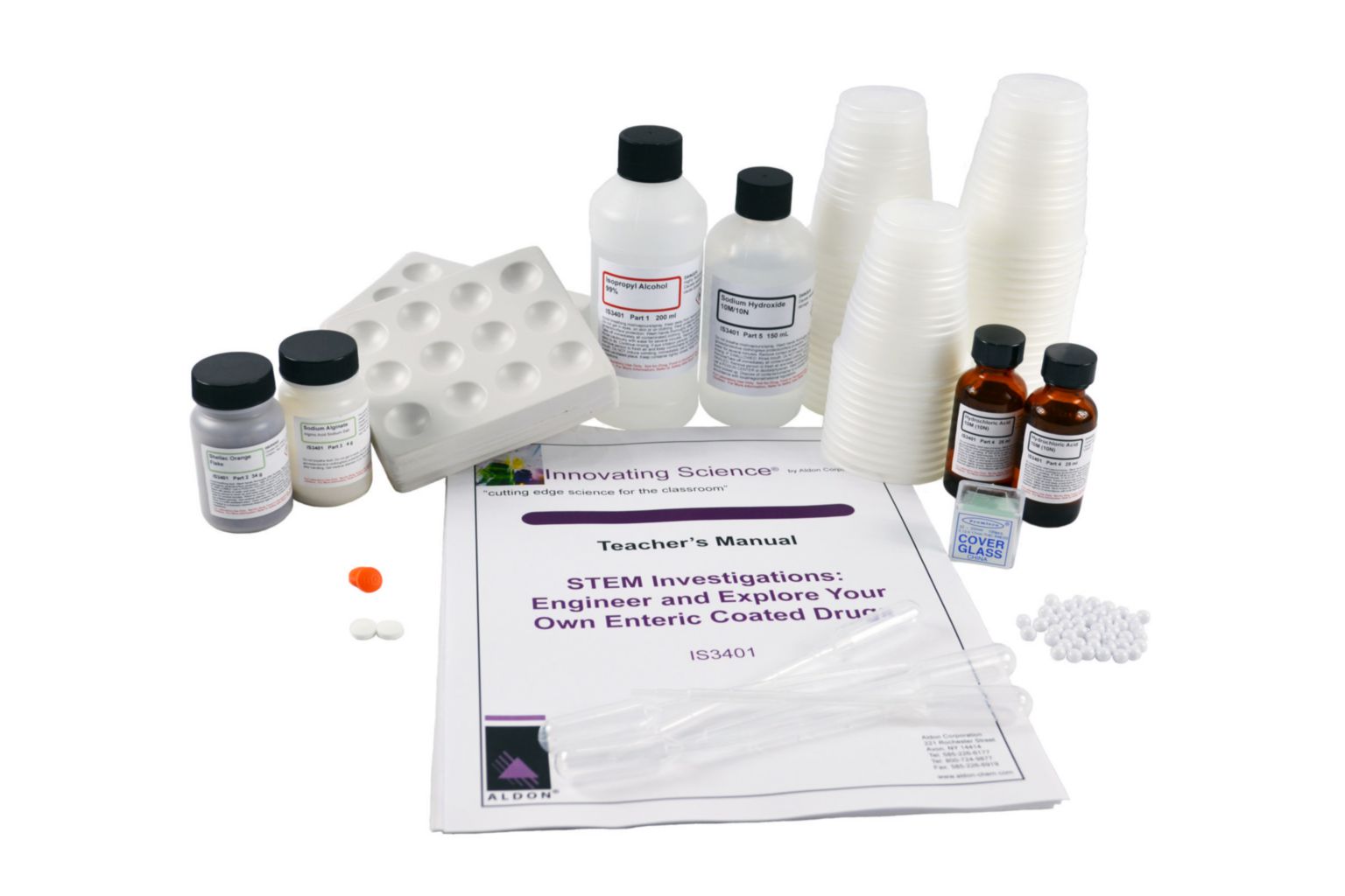 Enteric Coated Drugs (Stem)^ Engineer And Explore Your Own Enteric Coated Drugs, Includes: Isopropyl Alcohol 99%, Shellac Orange Flakes, Alginic Acid Sodium Salt, Hydrochloric Acid 10M, Sodium Hydroxide, Aspirin Tablets Enteric-Coated And Regular 50X5Oz Cup, Pipettes, Beads, Coverslips, Spot Plate