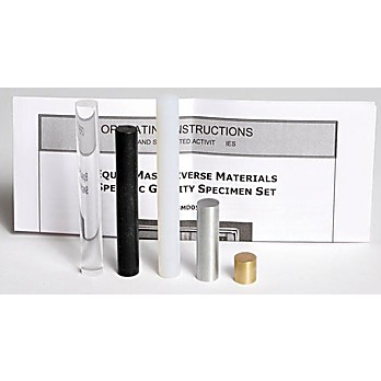Each specimen in this set of five diverse materials cylinders has identical mass and radius. Materials included are acrylic, PVC, nylon, aluminum and brass. Includes a storage box and activity guide.