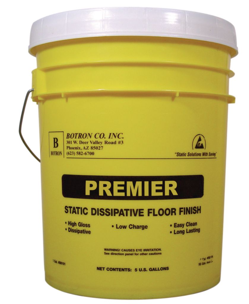 Premier Static Dissipative Floor Finish 5Gallon^ Premier Static Dissipative Floor Finish, Physical Data: P.H. 8.5, Rubber Streak Resistant, Fast Drying, High Gloss, Long Lasting, Non-Flaking, Non-Slip, Cross-Linked Polymer, Approximate Coverage Is 1500 - 2000 Sq Ft Per Gallon. Size: 5 Gallo
