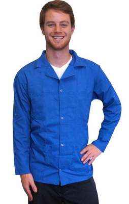 ESD Jacket Collar Knit Cuff 5X-large Nasa blue^ ESD Jacket, Full Length, Material: light weight 88% polyester and 12% carbon fabric for comfort, Conforms to ANSI/ESD 20.20, Low charging 12% carbon fabric, Lapel Collar, Snap Cuff, Color: Light Blue, Size: 5XL