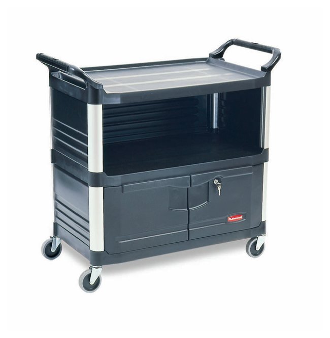 Big enough to carry large loads, with smooth maneuverability provided by large, nonmarking casters and a handle on each end. Transports equipment and supplies on three high-capacity shelves, and keeps expensive contents secure behind locking doors. Features attractive “front of the house” styling. Measures 40 5/8L × 20 3/4W × 37 7/8 in.H (103 × 53 × 96cm), with a total load capacity of 300 lb. (136kg). Black.