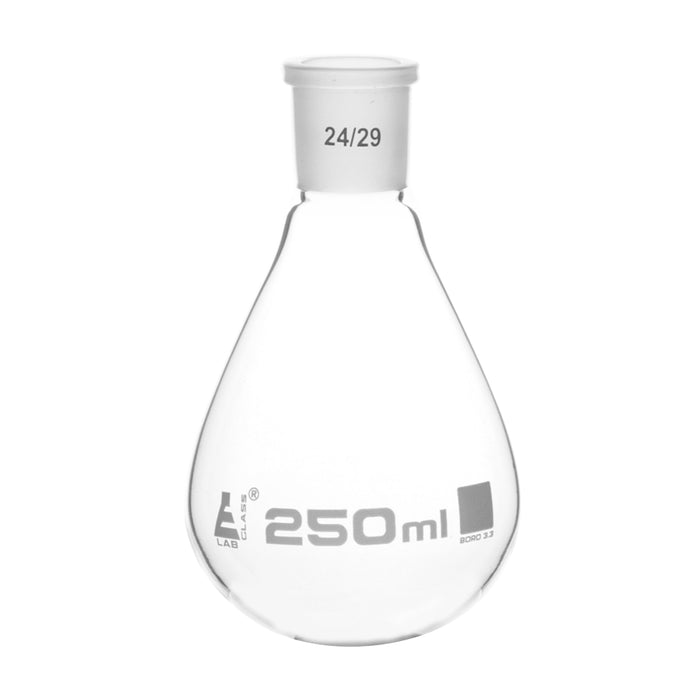 250ml capacity evaporating flask made of high quality, heavy duty 3.3 borosilicate glass. Single, interchangeable joint with 24/29 size socket. No stopper included. Flask stands 5.75" tall, and is 3.25" in diameter at its widest point.