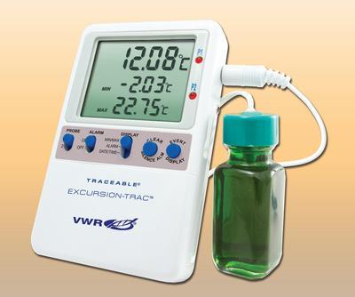 Resolution: 0.01°C, High/Low Alarm with Time/Date Stamp is an alarm tracking feature which stores in memory each alarm event, detailing when the alarm state occurred, as well as when the unit returned back to within range., Alarm state indicators include visual LEDs, audio alerts, and flashing LCD segments, 04_BodyText: High-accuracy thermometer has a temperature range of -58 to 158°F (-50 to 70°C) and resolution of 0.01°C. It maintains an accuracy of ±0.25°C across the entire temperature range. Ideal for monitoring temperatures in refrigerators, freezers, water baths, heating blocks, and incubators. Bottle probes are sealed in a miniature bottle (1x2½) filled with nontoxic glycol. Solution is deemed GRAS (generally recognized as safe) by the FDA (Food and Drug Administration). Eliminates concerns about incidental contact with food or drinking water. Temperature-buffered bottle sensor eliminates rapid changes when refrigerator door is opened. Ideal for use in monitoring storage conditions for vaccines or other important samples., 05_BodyText: Data for up to 10 different alarm events can be retrieved with the most current event viewable on the display. A new USB Data Transfer feature allows recorded data (CSV file) to be transferred from thermometer to PC or Mac using a USB flash drive (not included). No software is needed for computer interface. Each thermometer has a unique ID allowing multiple units to be used in the same location. Datalogging features include monitor readings overnight, on weekends, or for any time period with rolling data log. User-defined data-logging interval of one observation/minute to one observation/24 hours. Memory capacity maintains a year of recorded data when using 1 minute intervals and longer when using larger intervals., 02_BulletPoint: Datalogging thermometer with user-defined time intervals | Stores up to 10 unique alarm events | Meets current CDC requirements for vaccine storage and monitoring | Rolling memory structure, maintains most recent 525,600 temperature observations | Memory can be cleared on unit after downloading data to USB stick | Hassle-free data retrieval | Unit can remain in use while downloading and analyzing data | Status indicators - low battery, memory full, USB data transfer, and active alarm state, 08_Certifications: An individually-numbered Traceable® Certificate is provided which assures accuracy from VWR® ISO 17025 calibration laboratory accredited by A2LA. It indicates traceability to standards provided by NIST (National Institute of Standards and Technology)., 10_Ordering: Includes high-impact, chemical-resistant ABS plastic case (2¾ x 4¼ x ¾"). Weight is 5 ounces. Supplied with stand, Velcro®, magnetic strips, wall mount, Traceable® Certificate, and batteries., Cat. No.: 10154-386, Accuracy: ±0.25°, Probe: 2 vaccine bottle probes (glycol), Range: –50.0… 70.0 °C (–58… 158 °F), Resolution: 0.01°C, High/Low Alarm with Time/Date Stamp is an alarm tracking feature which stores in memory each alarm event, detailing when the alarm state occurred, as well as when the unit returned back to within range., Alarm state indicators include visual LEDs, audio alerts, and flashing LCD segments, 04_BodyText: High-accuracy thermometer has a temperature range of -58 to 158°F (-50 to 70°C) and resolution of 0.01°C. It maintains an accuracy of ±0.25°C across the entire temperature range. Ideal for monitoring temperatures in refrigerators, freezers, water baths, heating blocks, and incubators. Bottle probes are sealed in a miniature bottle (1x2½) filled with nontoxic glycol. Solution is deemed GRAS (generally recognized as safe) by the FDA (Food and Drug Administration). Eliminates concerns about incidental contact with food or drinking water. Temperature-buffered bottle sensor eliminates rapid changes when refrigerator door is opened. Ideal for use in monitoring storage conditions for vaccines or other important samples., 05_BodyText: Data for up to 10 different alarm events can be retrieved with the most current event viewable on the display. A new USB Data Transfer feature allows recorded data (CSV file) to be transferred from thermometer to PC or Mac using a USB flash drive (not included). No software is needed for computer interface. Each thermometer has a unique ID allowing multiple units to be used in the same location. Datalogging features include monitor readings overnight, on weekends, or for any time period with rolling data log. User-defined data-logging interval of one observation/minute to one observation/24 hours. Memory capacity maintains a year of recorded data when using 1 minute intervals and longer when using larger intervals., 02_BulletPoint: Datalogging thermometer with user-defined time intervals | Stores up to 10 unique alarm events | Meets current CDC requirements for vaccine storage and monitoring | Rolling memory structure, maintains most recent 525,600 temperature observations | Memory can be cleared on unit after downloading data to USB stick | Hassle-free data retrieval | Unit can remain in use while downloading and analyzing data | Status indicators - low battery, memory full, USB data transfer, and active alarm state, 08_Certifications: An individually-numbered Traceable® Certificate is provided which assures accuracy from VWR® ISO 17025 calibration laboratory accredited by A2LA. It indicates traceability to standards provided by NIST (National Institute of Standards and Technology)., 10_Ordering: Includes high-impact, chemical-resistant ABS plastic case (2¾ x 4¼ x ¾"). Weight is 5 ounces. Supplied with stand, Velcro®, magnetic strips, wall mount, Traceable® Certificate, and batteries., Cat. No.: 10154-384, Accuracy: ±0.25°, Probe: 1 vaccine bottle probe (glycol), Range: –50.0… 70.0 °C (–58… 158 °F), High/Low Alarm with Time/Date Stamp is an alarm tracking feature which stores in memory each alarm event, detailing when the alarm state occurred, as well as when th