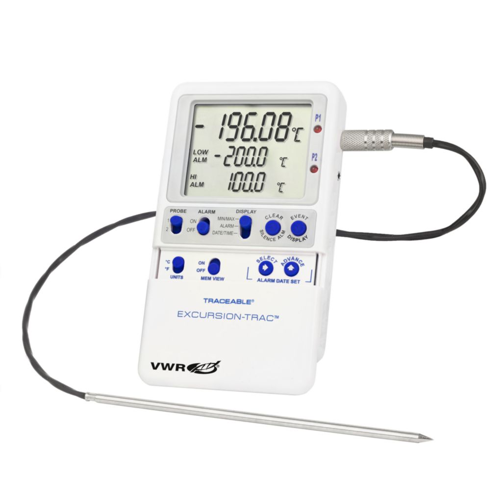 These Traceable® Excursion-Trac™ USB Datalogging LN2 thermometers monitor the temperature in the liquid nitrogen Dewars, covering cryogenic needs for sensitive, irreplaceable biological samples., Hi/Lo alarms and time/date stamps: Alarm tracking feature stores in memory each alarm event detailing when the alarm state occurred, as well as when the unit returned back to within range., 04_BodyText: Smart-Alarm™ signals out-of-range conditions: When an out-of-range condition is sensed, the Smart-Alarm™ triggers. Smart-Alarm™ features visual and audible indicators which signal continuously until acknowledged, even if the parameter returns to the non-alarm range., 05_BodyText: USB data transfer: This liquid nitrogen temperature monitor allows recorded data, in a CSV format, to be transferred from the thermometer to PC/Mac with a USB flash drive (not included). Specific software is not needed for this thermometer and data can be deleted from memory. Each device has a unique ID that allows multiple units to be used in the same location., 06_BodyText: Datalogging features: Monitor readings overnight, on weekends, or for any time period with rolling data log. User-defined datalogging interval of one observation/minute to one observation/24 hours. Memory capacity maintains 1 year of recorded data when using 1 minute intervals and longer when using larger intervals. After transferring the data onto a USB stick, it can be cleared from memory on the base unit., 07_BodyText: Alarm state indicators include visual LEDs, audio alerts, and flashing LCD segments. Data for up to 10 different alarm events can be retrieved with the most current event viewable on the display. Highly accurate and reliable., 02_BulletPoint: Liquid Nitrogen USB datalogging thermometers with user-defined time intervals | Memory capacity of 525600 temperature observations and one year when using one minute intervals | Four calibration points (–196 °C, –80 °C, 0 °C, and 100 °C) with cable length of 10' | Recorded data (CSV file) may be transferred from base unit to PC or Mac using a USB flash drive, with no additional software needed | Smart-Alarm™ features a visual/audible alarm that continues to alarm even if unit returns to non-alarm conditions | Monitors readings for any period of time | Status indicators: low battery, data downloading status, flashing LCD symbols, and audio alarm indicating active alarms, 08_Certifications: CE marked. RoHS compliant. Traceable to NIST for accuracy. Multi-point calibration on an individually-numbered Traceable® certificate which assures accuracy from an ISO/IEC 17025:2005 (1750.01) calibration laboratory accredited by A2LA. It indicates traceability of measurements to the SI units through NIST or other recognized national measurement institutes (NMI) that are signatories to the CIPM mutual recognition agreement., 10_Ordering: Units are supplied with stainless steel probe/probes, universal AC adaptor, wall mount, Velcro®, magnetic strips, batteries, and an ISO 17025 Traceable® Certificate., Resolution: T: 0.01 °C, Interface: USB, These Traceable® Excursion-Trac™ USB Datalogging LN2 thermometers monitor the temperature in the liquid nitrogen Dewars, covering cryogenic needs for sensitive, irreplaceable biological samples., Hi/Lo alarms and time/date stamps: Alarm tracking feature stores in memory each alarm event detailing when the alarm state occurred, as well as when the unit returned back to within range., 04_BodyText: Smart-Alarm™ signals out-of-range conditions: When an out-of-range condition is sensed, the Smart-Alarm™ triggers. Smart-Alarm™ features visual and audible indicators which signal continuously until acknowledged, even if the parameter returns to the non-alarm range., 05_BodyText: USB data transfer: This liquid nitrogen temperature monitor allows recorded data, in a CSV format, to be transferred from the thermometer to PC/Mac with a USB flash drive (not included). Specific software is not needed for this thermometer and data can be deleted from memory. Each device has a unique ID that allows multiple units to be used in the same location., 06_BodyText: Datalogging features: Monitor readings overnight, on weekends, or for any time period with rolling data log. User-defined datalogging interval of one observation/minute to one observation/24 hours. Memory capacity maintains 1 year of recorded data when using 1 minute intervals and longer when using larger intervals. After transferring the data onto a USB stick, it can be cleared from memory on the base unit., 07_BodyText: Alarm state indicators include visual LEDs, audio alerts, and flashing LCD segments. Data for up to 10 different alarm events can be retrieved with the most current event viewable on the display. Highly accurate and reliable., 02_BulletPoint: Liquid Nitrogen USB datalogging thermometers with user-defined time intervals | Memory capacity of 525600 temperature observations and one year when using one minute intervals | Four calibration points (–196 °C, –80 °C, 0 °C, and 100 °C) with cable length of 10' | Recorded data (CSV file) may be transferred from base unit to PC or Mac using a USB flash drive, with no additional software needed | Smart-Alarm™ features a visual/audible alarm that continues to alarm even if unit returns to non-alarm conditions | Monitors readings for any period of time | Status indicators: low battery, data downloading status, flashing LCD symbols, and audio alarm indicating active alarms, 08_Certifications: CE marked. RoHS compliant. Traceable to NIST for accuracy. Multi-point calibration on an individually-numbered Traceable® certificate which assures accuracy from an ISO/IEC 17025:2005 (1750.01) calibration laboratory accredited by A2LA. It indicates traceability of measurements to the SI units through NIST or other recognized national measurement institutes (NMI) that are signatories to the CIPM mutual recognition agreement., 10_Ordering: Units are su