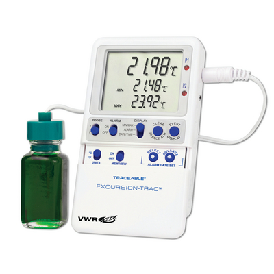 Resolution: 0.01°C, High/Low Alarm with Time/Date Stamp is an alarm tracking feature which stores in memory each alarm event, detailing when the alarm state occurred, as well as when the unit returned back to within range., Alarm state indicators include visual LEDs, audio alerts, and flashing LCD segments, 04_BodyText: High-accuracy thermometer has a temperature range of -58 to 158°F (-50 to 70°C) and resolution of 0.01°C. It maintains an accuracy of ±0.25°C across the entire temperature range. Ideal for monitoring temperatures in refrigerators, freezers, water baths, heating blocks, and incubators. Bottle probes are sealed in a miniature bottle (1x2½") filled with nontoxic glycol. Solution is deemed GRAS (generally recognized as safe) by the FDA (Food and Drug Administration). Eliminates concerns about incidental contact with food or drinking water. Temperature-buffered bottle sensor eliminates rapid changes when refrigerator door is opened. Ideal for use in monitoring storage conditions for vaccines or other important samples., 05_BodyText: Data for up to 10 different alarm events can be retrieved with the most current event viewable on the display. A new USB Data Transfer feature allows recorded data (CSV file) to be transferred from thermometer to PC or Mac using a USB flash drive (not included). No software is needed for computer interface. Each thermometer has a unique ID allowing multiple units to be used in the same location. Datalogging features include monitor readings overnight, on weekends, or for any time period with rolling data log. User-defined data-logging interval of one observation/minute to one observation/24 hours. Memory capacity maintains a year of recorded data when using 1 minute intervals and longer when using larger intervals., 02_BulletPoint: Datalogging thermometer with user-defined time intervals | Stores up to 10 unique alarm events | Meets current CDC requirements for vaccine storage and monitoring | Rolling memory structure, maintains most recent 525,600 temperature observations | Memory can be cleared on unit after downloading data to USB stick | Hassle-free data retrieval | Unit can remain in use while downloading and analyzing data | Status indicators - low battery, memory full, USB data transfer, and active alarm state, 08_Certifications: An individually-numbered Traceable® Certificate is provided which assures accuracy from VWR® ISO 17025 calibration laboratory accredited by A2LA. It indicates traceability to standards provided by NIST (National Institute of Standards and Technology)., 10_Ordering: Includes high-impact, chemical-resistant ABS plastic case (2¾ x 4¼ x ¾"). Weight is 5 ounces. Supplied with stand, Velcro®, magnetic strips, wall mount, Traceable® Certificate, and batteries., VWR® Traceable® Excursion-Trac® Thermometer, Cat. No.: 10048-618, Accuracy: ±0.25 °C, Probe: 1 bottle probe (glycol), Range: –50.0… 70.0 °C (–58… 158 °F), High/Low Alarm with Time/Date Stamp is an alarm tracking feature which stores in memory each alarm event, detailing when the alarm state occurred, as well as when the unit returned back to within range., Alarm state indicators include visual LEDs, audio alerts, and flashing LCD segments, 04_BodyText: High-accuracy thermometer has a temperature range of -58 to 158°F (-50 to 70°C) and resolution of 0.01°C. It maintains an accuracy of ±0.25°C across the entire temperature range. Ideal for monitoring temperatures in refrigerators, freezers, water baths, heating blocks, and incubators. Bottle probes are sealed in a miniature bottle (1x2½") filled with nontoxic glycol. Solution is deemed GRAS (generally recognized as safe) by the FDA (Food and Drug Administration). Eliminates concerns about incidental contact with food or drinking water. Temperature-buffered bottle sensor eliminates rapid changes when refrigerator door is opened. Ideal for use in monitoring storage conditions for vaccines or other important samples., 05_BodyText: Data for up to 10 different alarm events can be retrieved with the most current event viewable on the display. A new USB Data Transfer feature allows recorded data (CSV file) to be transferred from thermometer to PC or Mac using a USB flash drive (not included). No software is needed for computer interface. Each thermometer has a unique ID allowing multiple units to be used in the same location. Datalogging features include monitor readings overnight, on weekends, or for any time period with rolling data log. User-defined data-logging interval of one observation/minute to one observation/24 hours. Memory capacity maintains a year of recorded data when using 1 minute intervals and longer when using larger intervals., 02_BulletPoint: Datalogging thermometer with user-defined time intervals | Stores up to 10 unique alarm events | Meets current CDC requirements for vaccine storage and monitoring | Rolling memory structure, maintains most recent 525,600 temperature observations | Memory can be cleared on unit after downloading data to USB stick | Hassle-free data retrieval | Unit can remain in use while downloading and analyzing data | Status indicators - low battery, memory full, USB data transfer, and active alarm state, 08_Certifications: An individually-numbered Traceable® Certificate is provided which assures accuracy from VWR® ISO 17025 calibration laboratory accredited by A2LA. It indicates traceability to standards provided by NIST (National Institute of Standards and Technology)., 10_Ordering: Includes high-impact, chemical-resistant ABS plastic case (2¾ x 4¼ x ¾"). Weight is 5 ounces. Supplied with stand, Velcro®, magnetic strips, wall mount, Traceable® Certificate, and batteries., Resolution: 0.01°C, High/Low Alarm with Time/Date Stamp is an alarm tracking feature which stores in memory each alarm event, detailing when the alarm state occurred, as well as when the unit returned back to within range., Alarm state indicators include visual LEDs, au