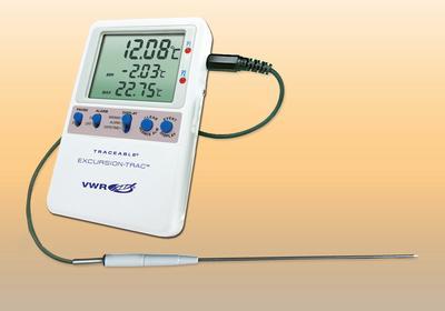 Resolution: 0.01°C, High/Low Alarm with Time/Date Stamp is an alarm tracking feature which stores in memory each alarm event, detailing when the alarm state occurred, as well as when the unit returned back to within range., Alarm state indicators include visual LEDs, audio alerts, and flashing LCD segments, 04_BodyText: High-accuracy thermometer has a temperature range of -58 to 158°F (-50 to 70°C) and resolution of 0.01°C. It maintains an accuracy of ±0.25°C across the entire temperature range. Ideal for monitoring temperatures in refrigerators, freezers, water baths, heating blocks, and incubators. Bottle probes are sealed in a miniature bottle (1x2½") filled with nontoxic glycol. Solution is deemed GRAS (generally recognized as safe) by the FDA (Food and Drug Administration). Eliminates concerns about incidental contact with food or drinking water. Temperature-buffered bottle sensor eliminates rapid changes when refrigerator door is opened. Ideal for use in monitoring storage conditions for vaccines or other important samples., 05_BodyText: Data for up to 10 different alarm events can be retrieved with the most current event viewable on the display. A new USB Data Transfer feature allows recorded data (CSV file) to be transferred from thermometer to PC or Mac using a USB flash drive (not included). No software is needed for computer interface. Each thermometer has a unique ID allowing multiple units to be used in the same location. Datalogging features include monitor readings overnight, on weekends, or for any time period with rolling data log. User-defined data-logging interval of one observation/minute to one observation/24 hours. Memory capacity maintains a year of recorded data when using 1 minute intervals and longer when using larger intervals., 02_BulletPoint: Datalogging thermometer with user-defined time intervals | Stores up to 10 unique alarm events | Meets current CDC requirements for vaccine storage and monitoring | Rolling memory structure, maintains most recent 525,600 temperature observations | Memory can be cleared on unit after downloading data to USB stick | Hassle-free data retrieval | Unit can remain in use while downloading and analyzing data | Status indicators - low battery, memory full, USB data transfer, and active alarm state, 08_Certifications: An individually-numbered Traceable® Certificate is provided which assures accuracy from VWR® ISO 17025 calibration laboratory accredited by A2LA. It indicates traceability to standards provided by NIST (National Institute of Standards and Technology)., 10_Ordering: Includes high-impact, chemical-resistant ABS plastic case (2¾ x 4¼ x ¾"). Weight is 5 ounces. Supplied with stand, Velcro®, magnetic strips, wall mount, Traceable® Certificate, and batteries., VWR® Traceable® Excursion-Trac® Thermometer, Cat. No.: 10048-618, Accuracy: ±0.25 °C, Probe: 1 bottle probe (glycol), Range: –50.0… 70.0 °C (–58… 158 °F), High/Low Alarm with Time/Date Stamp is an alarm tracking feature which stores in memory each alarm event, detailing when the alarm state occurred, as well as when the unit returned back to within range., Alarm state indicators include visual LEDs, audio alerts, and flashing LCD segments, 04_BodyText: High-accuracy thermometer has a temperature range of -58 to 158°F (-50 to 70°C) and resolution of 0.01°C. It maintains an accuracy of ±0.25°C across the entire temperature range. Ideal for monitoring temperatures in refrigerators, freezers, water baths, heating blocks, and incubators. Bottle probes are sealed in a miniature bottle (1x2½") filled with nontoxic glycol. Solution is deemed GRAS (generally recognized as safe) by the FDA (Food and Drug Administration). Eliminates concerns about incidental contact with food or drinking water. Temperature-buffered bottle sensor eliminates rapid changes when refrigerator door is opened. Ideal for use in monitoring storage conditions for vaccines or other important samples., 05_BodyText: Data for up to 10 different alarm events can be retrieved with the most current event viewable on the display. A new USB Data Transfer feature allows recorded data (CSV file) to be transferred from thermometer to PC or Mac using a USB flash drive (not included). No software is needed for computer interface. Each thermometer has a unique ID allowing multiple units to be used in the same location. Datalogging features include monitor readings overnight, on weekends, or for any time period with rolling data log. User-defined data-logging interval of one observation/minute to one observation/24 hours. Memory capacity maintains a year of recorded data when using 1 minute intervals and longer when using larger intervals., 02_BulletPoint: Datalogging thermometer with user-defined time intervals | Stores up to 10 unique alarm events | Meets current CDC requirements for vaccine storage and monitoring | Rolling memory structure, maintains most recent 525,600 temperature observations | Memory can be cleared on unit after downloading data to USB stick | Hassle-free data retrieval | Unit can remain in use while downloading and analyzing data | Status indicators - low battery, memory full, USB data transfer, and active alarm state, 08_Certifications: An individually-numbered Traceable® Certificate is provided which assures accuracy from VWR® ISO 17025 calibration laboratory accredited by A2LA. It indicates traceability to standards provided by NIST (National Institute of Standards and Technology)., 10_Ordering: Includes high-impact, chemical-resistant ABS plastic case (2¾ x 4¼ x ¾"). Weight is 5 ounces. Supplied with stand, Velcro®, magnetic strips, wall mount, Traceable® Certificate, and batteries., Resolution: 0.01°C, High/Low Alarm with Time/Date Stamp is an alarm tracking feature which stores in memory each alarm event, detailing when the alarm state occurred, as well as when the unit returned back to within range., Alarm state indicators include visual LEDs, au