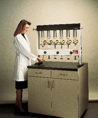 Goldfisch Fat and Oil Extractor^ For determination of fat/oil content in samples not exceeding 5g. Includes twelve 100ml beakers, six 100W heater elements, six stirrup supports, six stainless steel condensers, and six automatic pressure-release valves. 90.75Wx23Dx68.25Hcm. 115V, 50/60Hz, 5.2A, 600W.