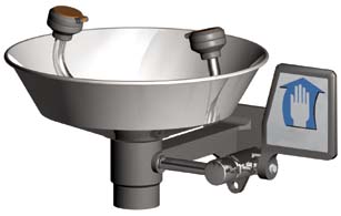 Wall Mounted Eye and Face Wash^ With two gentle spray outlet heads, stainless steel bowl and stay-open ball valve. For use in laboratories and cleanrooms where exposure to critical solutions and chemicals is high.