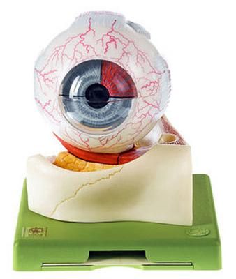 Model^ Eyeball, enlarged approximately 5 times, in somso-plast*, resting in the lower bones of the orbit, sectioned horizontally and separates into 7 parts: sclerotic membrane (2), choroid membrane (2), retina with vitreous humour, lens. height: 21cm, width: 18cm, depth: 18cm, weight: 1.2kg.
