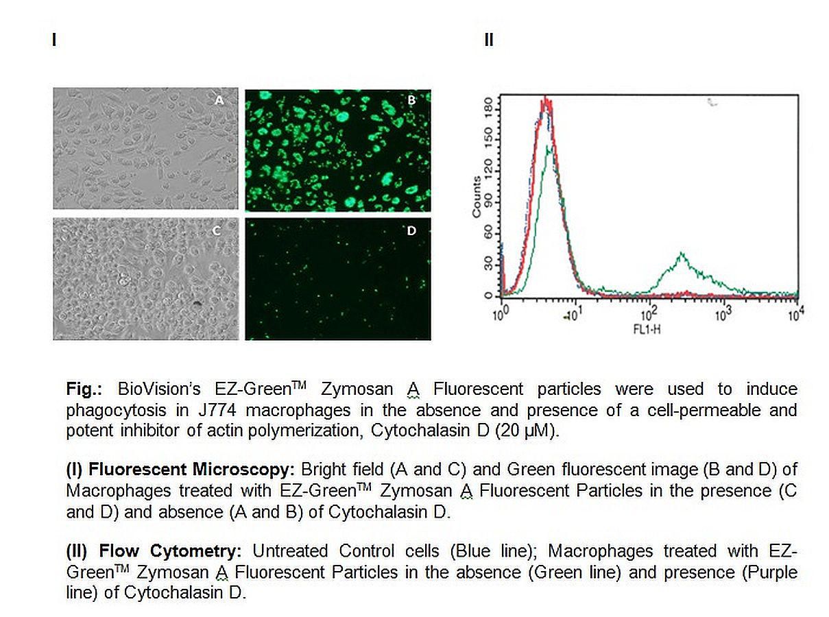 Ez-Green Zymosan A Fluorescent Particles 500ul^ Ez-Green Zymosan A Fluorescent Particles, Source: Saccharomyces cerevisiae, Form: Liquid, FORMULATION: 1 mg/ml solution in PBS, Store at 4 deg C. Synonyms: Zymosan, Zymosan A, Application: fluorescent imaging, Size: 500ul