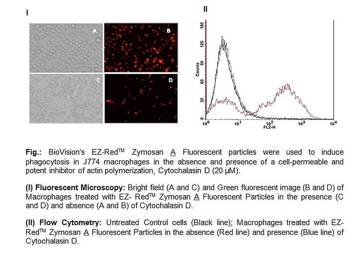 Ez-Red* Zymosan A Fluorescent Particles 500ul^ Ez-Red* Zymosan A Fluorescent Particles, Source: Saccharomyces cerevisiae, Form: Liquid, FORMULATION: 1 mg/ml solution in PBS, Store at 4 deg C. Synonyms: Zymosan, Zymosan A, Application: fluorescent imaging, Size: 500ul