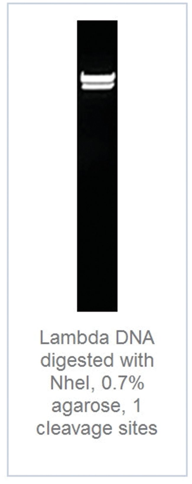 Lambda DNA digested with NheI, 0.7% agarose, 1 cleavage sitesFastDigest enzymes are an advanced line of fast restriction enzymes that are all 100% active in the universal FastDigest and FastDigest Green reaction buffers.The universal buffer allows rapid single-, double- or multiple DNA digestion within 5-15 minutes eliminating any need for buffer change or subsequent DNA clean-up steps. DNA modifying enzymes, such as Klenow Fragment, T4 DNA Ligase, alkaline phosphatases and T4 DNA Polymerase all have 100% activity in FastDigest Buffer. Therefore, enzymes for downstream applications can be directly added to the FastDigest reaction mix.For additional convenience FastDigest Green Buffer includes a density reagent and two tracking dyes for direct loading of digestion reaction products on gels.Short incubation times and optimal composition of the universal FastDigest Buffer eliminate star activity effects.Highlights100% activity of all FastDigest enzymes in the universal buffer100% buffer compatibility with downstream applicationsComplete digestion in 5-15 minutesDirect loading on gelsNo star activity176 FastDigest enzymes availableThis product(s) resides on a Fisher Scientific GSA or VA contract. If you are viewing this page as a nonregistered user, the price(s) displayed is List Price. To view your GSA or VA contract pricing, log in using your account number, or become a registered user by contacting one of our Customer Service teams. You can also view your contract price by searching for this item(s) on GSA Advantage. To place an order, contact Fisher Scientific Customer Service.