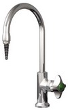 Distilled Water Gooseneck Faucet, Tin-Lined^ Deck mounted chrome-plated brass faucet with a tin-lined interior and white nylon self-closing 4-arm handle. 20.3cm spread gooseneck with removable serrated hose end. Complete with 1.27cm IPS shank, locknut and washer.